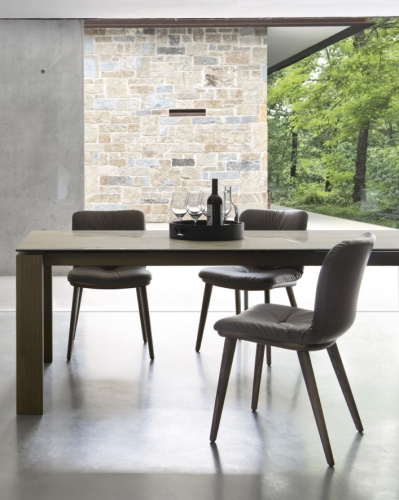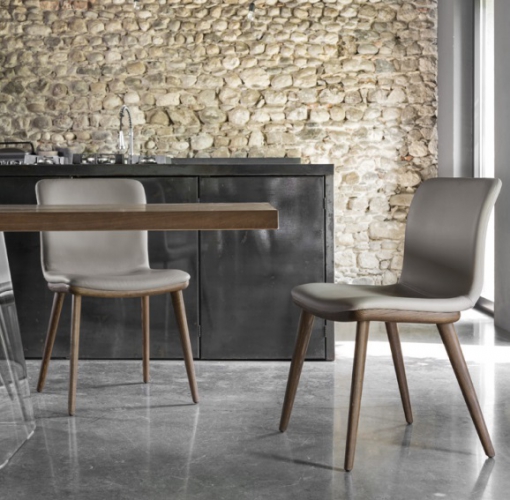 Annie is een tijdloze stoel met verschillene mogelijkheden, zowel qua bekleding (stof of leder) als poten (hout of metaal). Hij is verkrijgbaar in de standaard of de wat dikker gegarnierde soft versie.