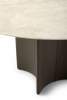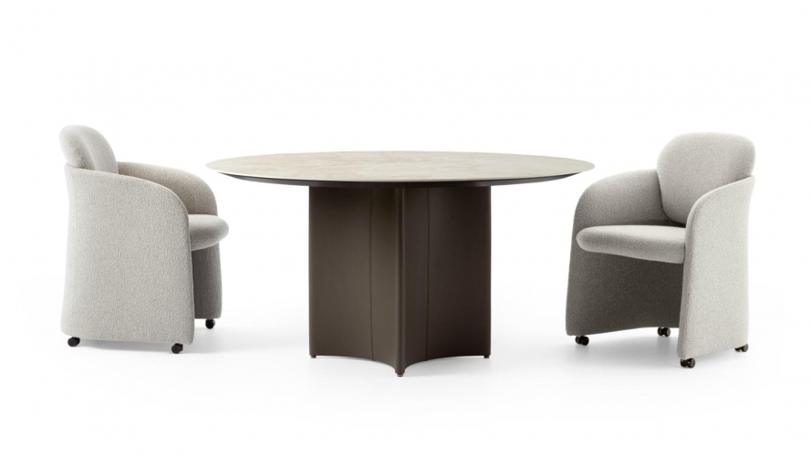 Conka van Studio Kaschkasch is een praktische ronde tafel met een heel eigen gezicht. Niet alleen valt zijn fraaie tafelblad in massief hout of keramiek direct op, ook de ruitvormige met leder beklede kolom onder het blad is een bezienswaardigheid op zich!