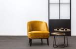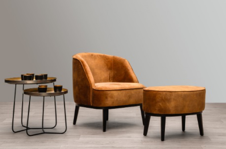 Comfortabele bijzetzetel, verkrijgbaar in stof en in leder met houten poten (eveneens verkrijgbaar in verschillende houttinten).